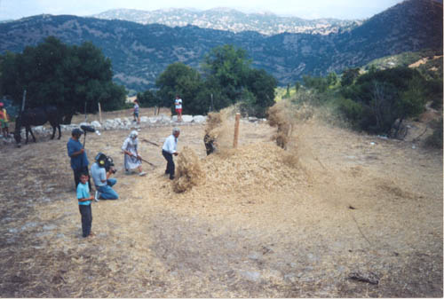 Γυναίκες και άντρες με τα δικράνια τους λιγνίζουν τον καρπό για να ξεχωρίσει από το άχυρο.
