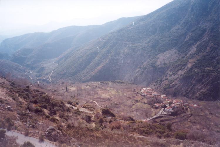 Παλιοχώρι 2002 - Άποψη του χωριού από τη Δημητσάνα. Διακρίνεται το φαράγγι του Λούσιου.