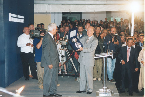 Ο Πρόεδρος της Διοικούσας Επιτροπής του Πανεπιστημίου Πελοποννήσου κ. Κωνσταντίνος Δημόπουλος επιδίδει στον Πρωθυπουργό κ. Κ. Σημίτη αναμνηστική πλακέτα, κατά την ημέρα των εγκαινίων του Πανεπιστημίου.