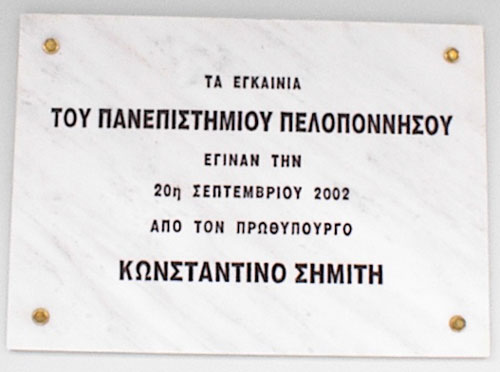 Μαρμάρινη επιγραφή στην είσοδο του Πανεπιστημίου Πελοποννήσου.