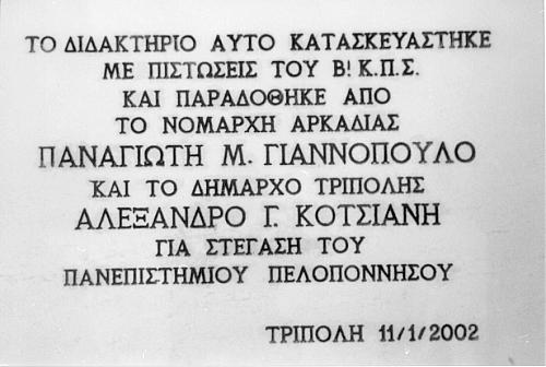 Μαρμάρινη επιγραφή στην είσοδο του Πανεπιστημίου Πελοποννήσου.