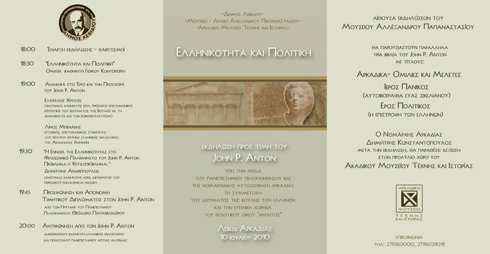 Στο Έργο και την προσφορά του John P. Anton, θα αναφερθούν οι: