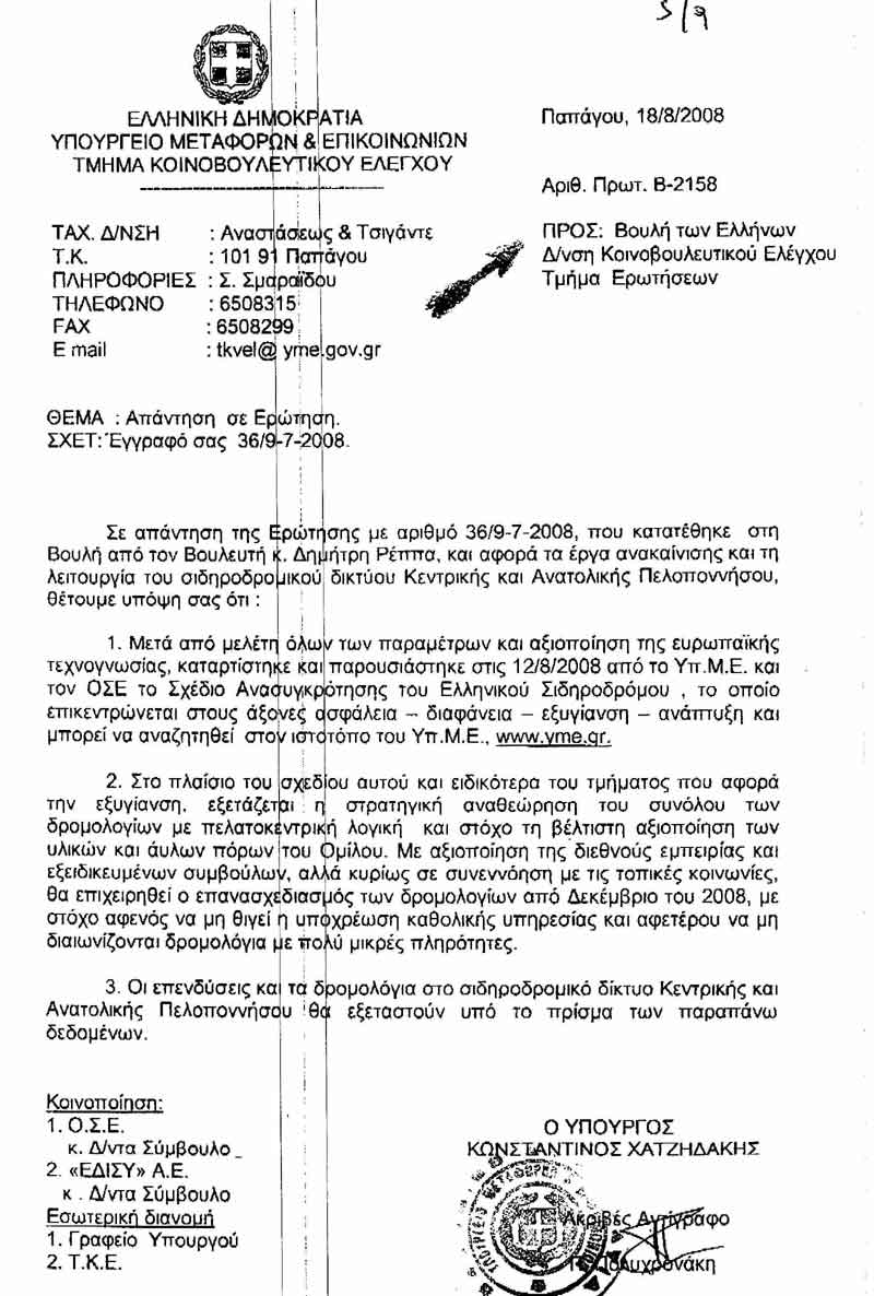 (Β-2158/18.8.2008) της τελευταίας Ερώτησής μου (36/9.7.2008) η