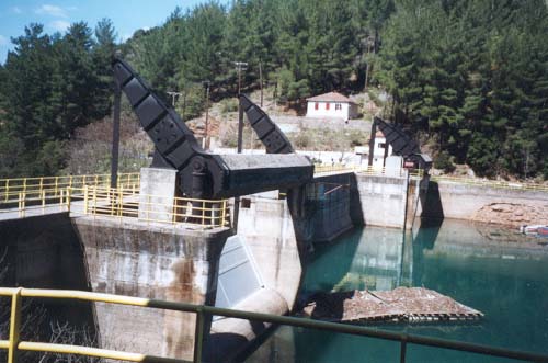 Το φράγμα της τεχνητής λίμνης του Λάδωνα. Διακρίνονται οι υπερχιλιστές για την εκφόρτιση των πλημμυρικών νερών πάνω από τη στάθμη των 420 μέτρων.