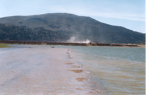 Άποψη της λίμνης Τάκα. Τα υδρόβια πουλιά ενοχλημένα από την παρουσία των μηχανημάτων, λόγω των έργων που γίνονται στην περιοχή, πετούν πάνω από τη λίμνη προσφέροντας ένα ξεχωριστό θέαμα.